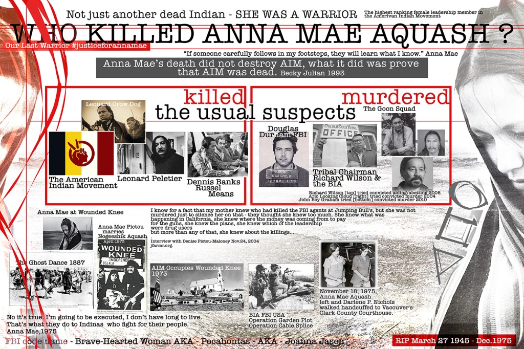 Her murder remains unsolved, though according to her daughter Denise Malone Aquash, her mother knew. She knew where the bodies were buried. She knew who among AIM leadership were junkies, who had mistresses, and who was using AIM to sell guns She knew too much. So Either Richard Wilson (the catalyst for Occupy Wounded Knee circa 1973) and his goon squad killed her, or her death was sanctioned and carried out by the FBI – She was labelled a dissident, a homeland terrorist, and/or any of the 300 000 subsections the FBI compiled on American Native Activism.
