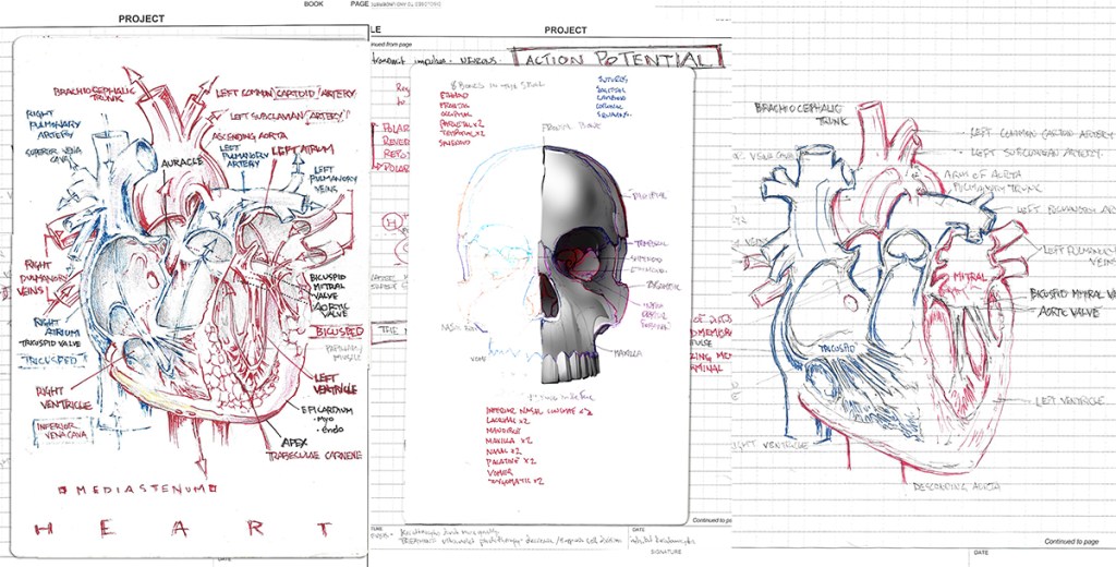 My science electives; Anatomy & Physiology. Referred to by Dr. Stredonsky as ‘the outlier’, with absolutely no background in biology. Studying among the nursing discipline (RESPECT). The discovery that the human body operates on two principles; pressure gradients and membrane potential. I now have a much more elaborate understanding of the human body and it’s myriad complexities. Above are (left and centre) anatomy illustrations done my myself, (right) a physiological sketch composed after a much deeper understanding of the functionality of the incredible human heart (the strawberry love-pump).